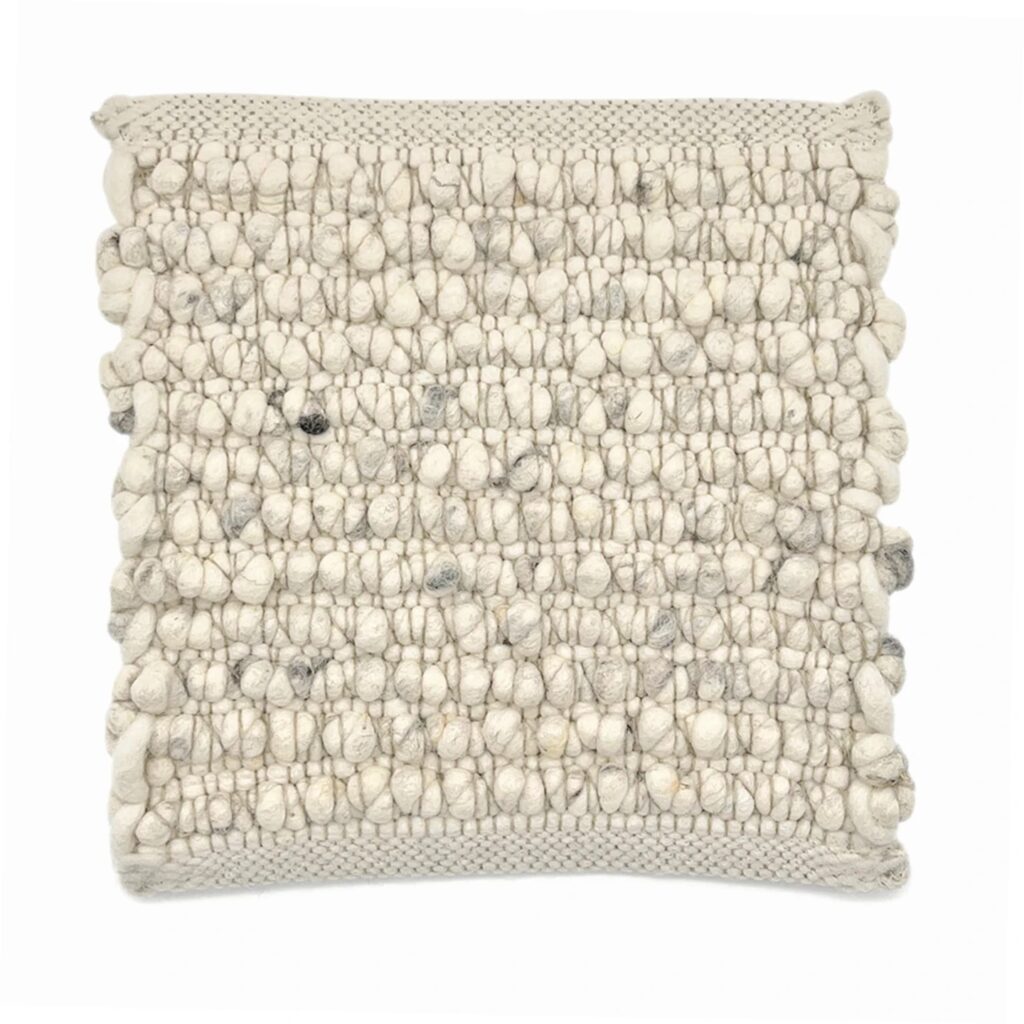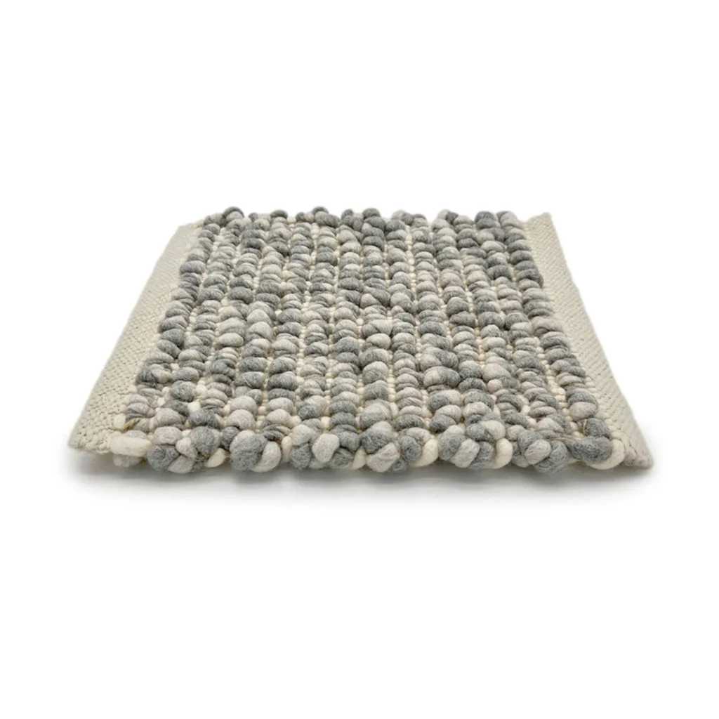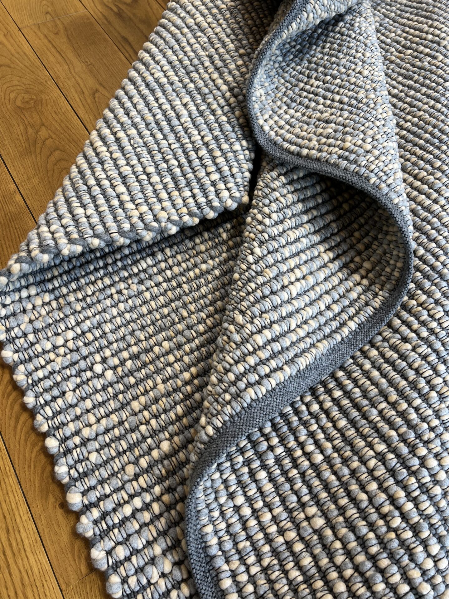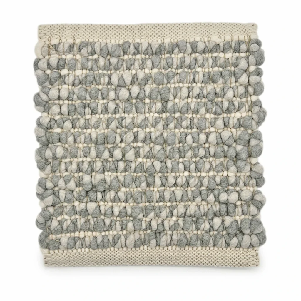 Dieser Handwebteppich aus 100 % reiner, gewalkter Schurwolle erhält seine erhabene Rippenstruktur durch 2 dicke miteinander verzwirnte Wollstränge und einen dünner Zwischenschuß. Je nachdem, ob eine wollweiße
